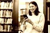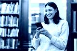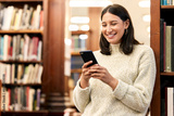 College, library and smile of girl with phone for campus research, literature website or networking. Scholarship, student and person with smartphone for education, email or media update in London