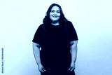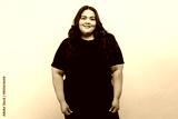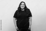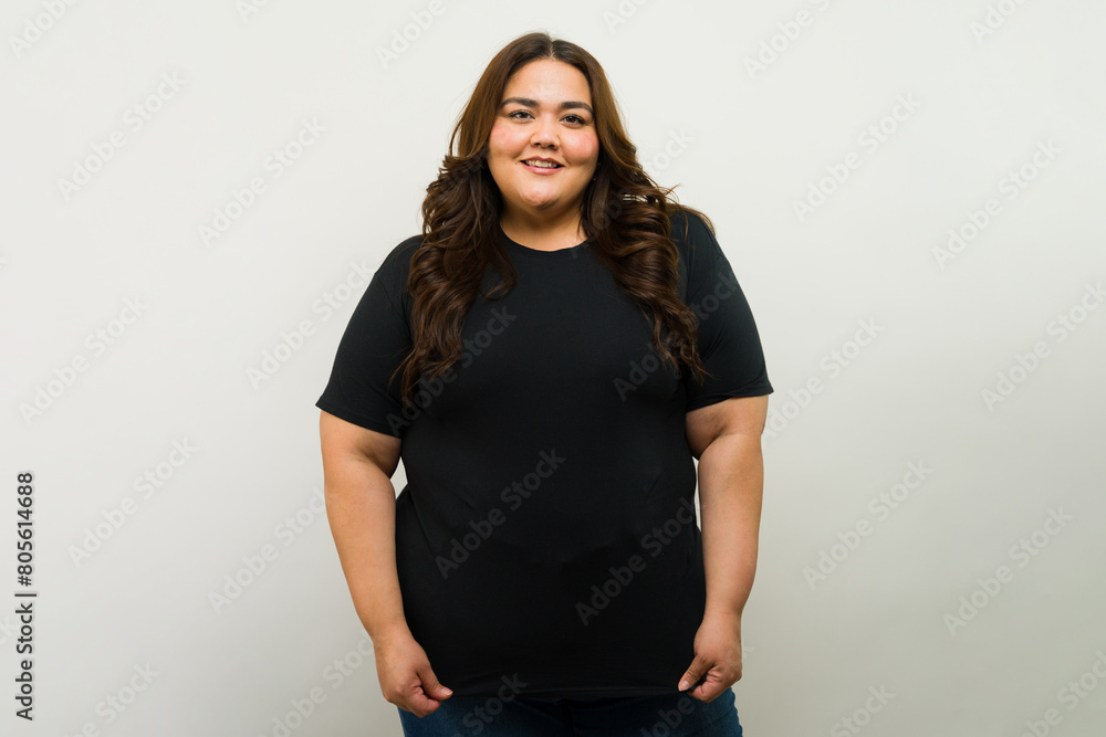 Beautiful plus-size woman posing with a black t-shirt for a mockup in a studio with white background