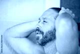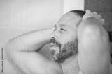 Handsome man mustache beard outdoor shower. cleaning the body Cleanse dirt on body.