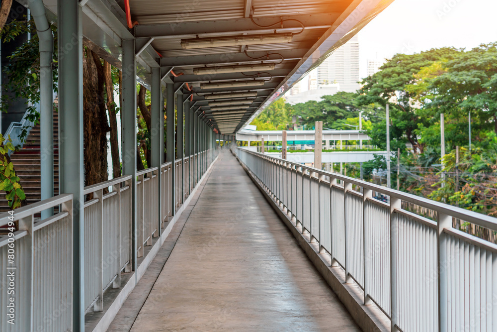 Sheltered walkway of an overhead bridge in a residential neighborhood.