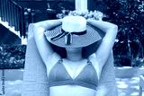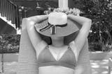 Female friends in bikinis sunbathing, reading books, sipping wine, chatting by the pool.