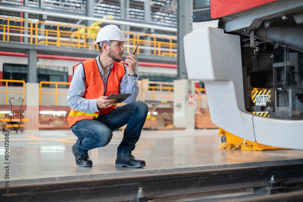 Railway maintenance engineers check readiness in the locomotive repair shop.