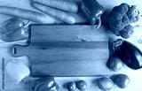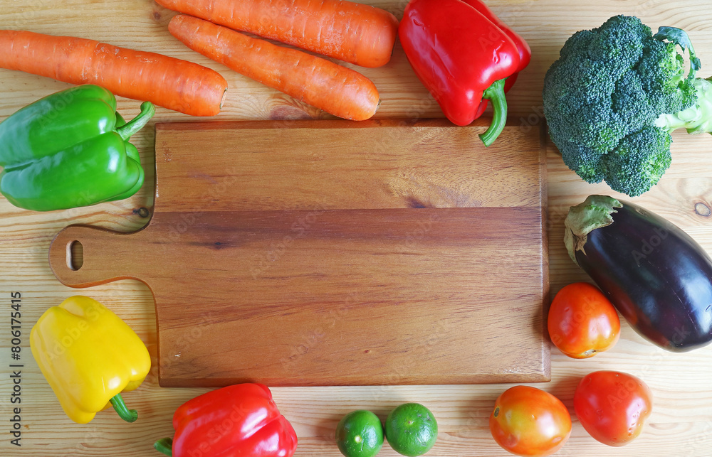 Colorful fresh mixed vegetables surrounding an empty wooden chopping board