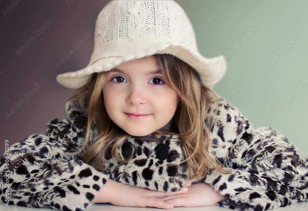 Pretty little girl in fashion clothes&hat. Female child portrait