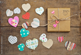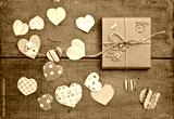 A gift on wooden background with hearts