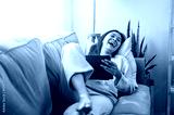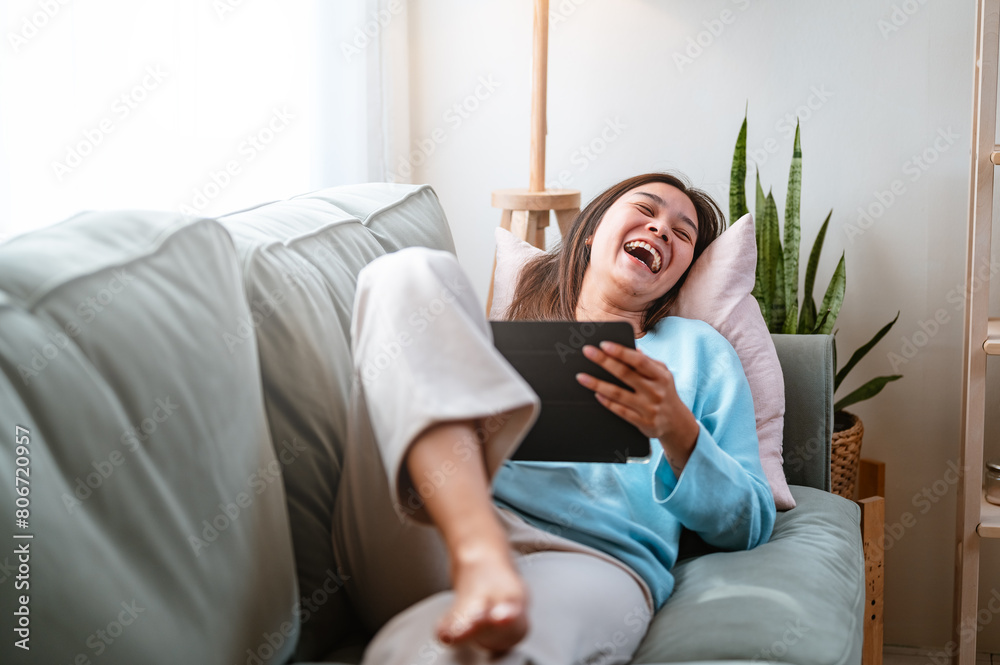 enjoyment, lying, cute, rest, living, cozy, pretty, relaxing, couch, comfortable. A woman is sitting on a couch with a tablet in her lap. She is smiling and laughing while using the tablet.