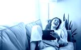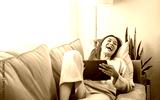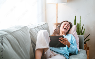 enjoyment, lying, cute, rest, living, cozy, pretty, relaxing, couch, comfortable. A woman is sitting on a couch with a tablet in her lap. She is smiling and laughing while using the tablet.