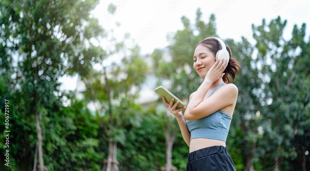fit, relaxation, fitness, sport, exercising, run, runner, wellness, jogging, jogger. A woman is walking in a park while listening to music. She is wearing headphones and holding a smartphone.
