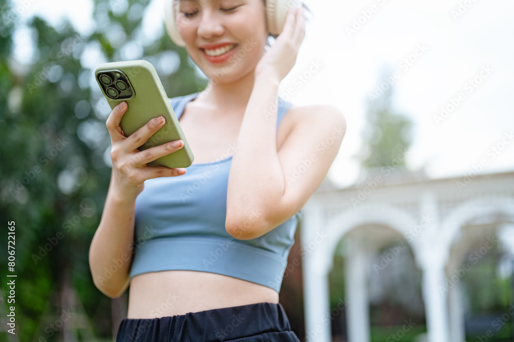 fitness, exercise, run, runner, sports, health, training, sporty, workout, outside. A woman is holding a cell phone and smiling. She is wearing headphones and she is listening to music.