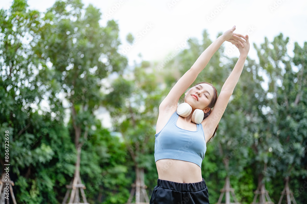training, fit, relaxation, fitness, sport, exercise, meditation, muscle, run, runner. A woman is stretching in a park. She is wearing headphones and a blue tank top. Scene is relaxed and peaceful.