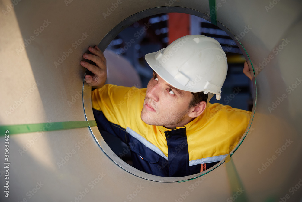 worker or technician checking a roll of industrial aluminum metal material in the factory