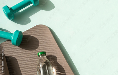 Sport or workout concept flat lay with blue dumbbells, yoga mat on the green background. Copy space