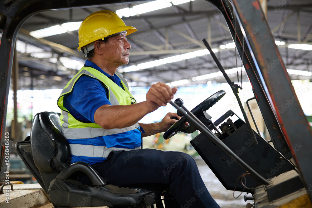 senior worker driving forklift in the factory
