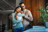 Peaceful young married couple enjoying being family, parents, holding new born baby in arms