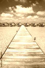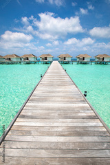 paradise beach destination in Maldives, wooden pier in hotel with luxury houses for tourists
