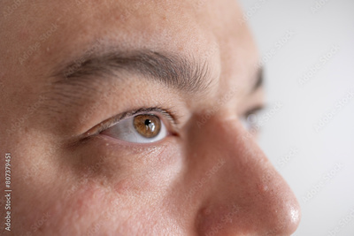 Intense gaze, Male Brown Eyes close-up, young Caucasian man looking, Masculine beauty, vision examination, myopia, eye fatigue, color perception