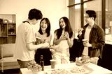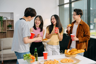 Young Asian friend having, enjoy evening party together at home. Attractive young man and woman having fun, eating foo