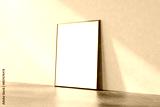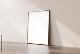 Blank frame with a wooden border leaning against a beige wall on a wooden floor, with ample empty space for text or graphics, 3d render.