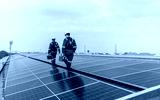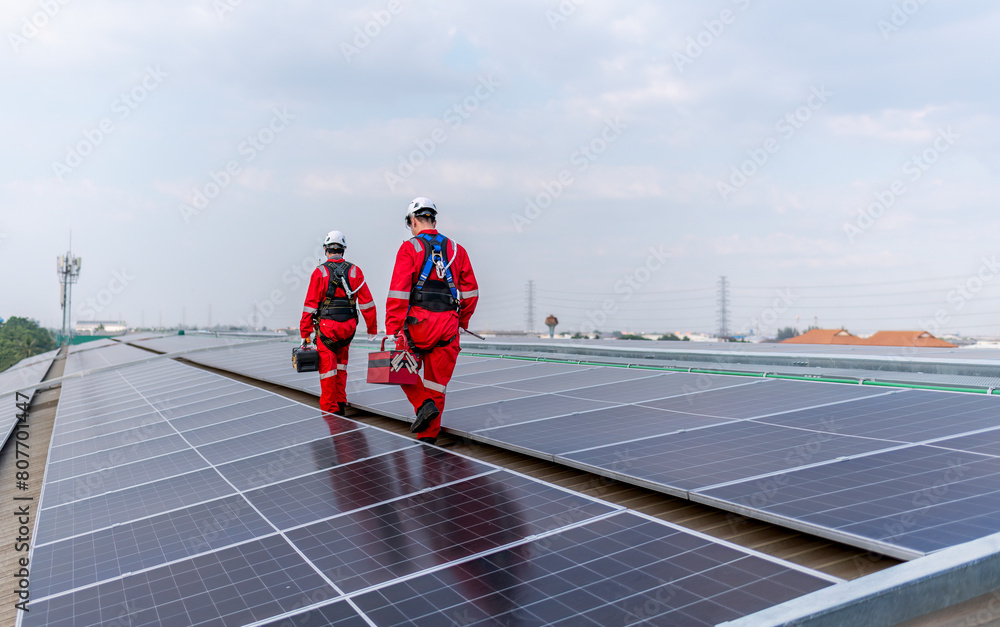 Engineers walking and holding box on factory roof inspection survey and check solar cell panel .Solar cell is smart grid sustainable ecology energy sunlight alternative power factory concept.