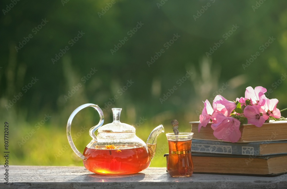 glass teapot and cup with herbal tea, pink flowers and books on table in garden, natural background. summer season. harmony, peaceful, relax time. useful calming tea. Tea party outdoor