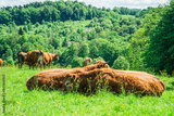 Krowy na pastwisku w górach wiosną, podczas pięknej słonecznej pogody