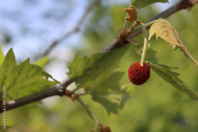 Plane or Sycamore tree with green new leaves and red fruits on branches. Platanus occidentalis on springtime
