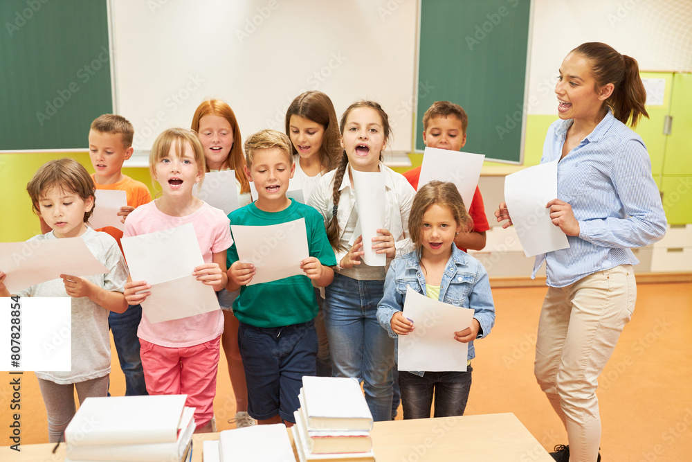 Group of elementary school children singing song together in choir
