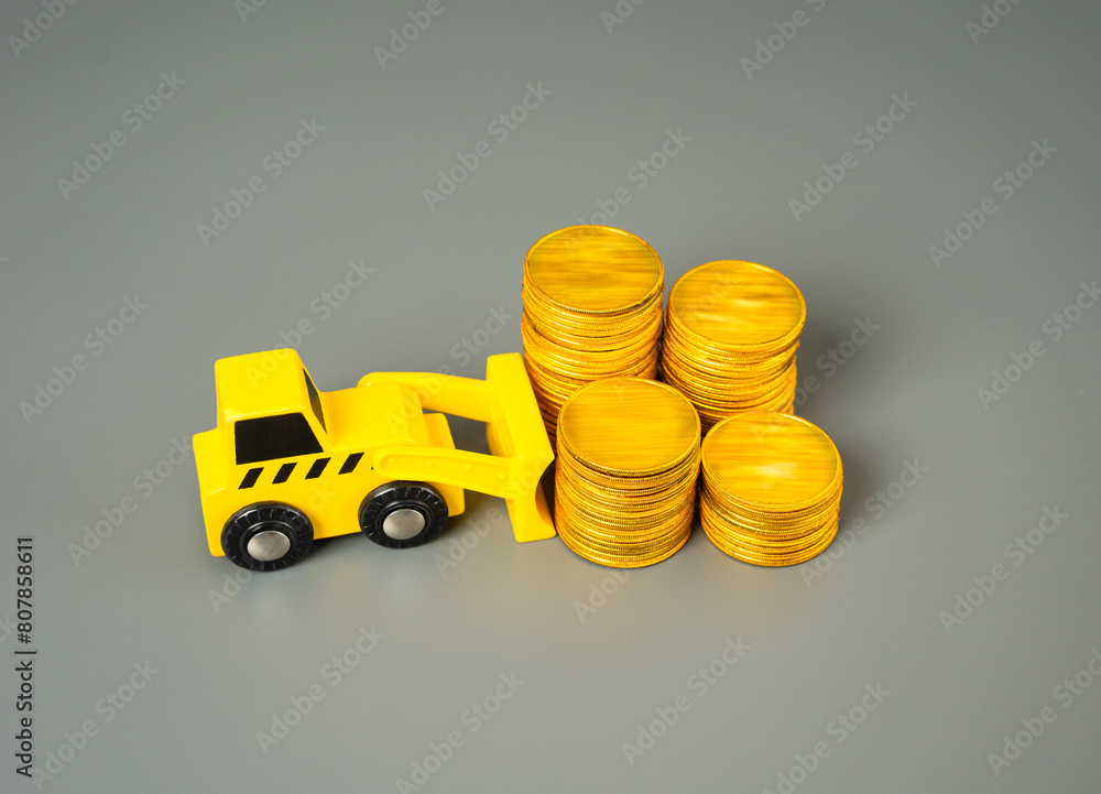 Accumulation of money and savings. A forklift pushes money coins into a stack. Attract investment. Deposits and savings benefits. Gain fortune. Reliable storage, inflation protection.
