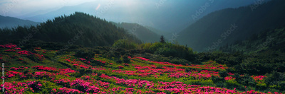 Carpathians, Ukraine, Europe, summer blooming pink flowers on background mountains, floral summer landscape