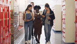 Teen, group and walking in hallway of school, shock and surprise with news in phone, student and smile. Highschool, girls and reading of message or text on mobile, kids and invitation to prom
