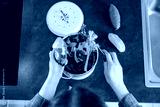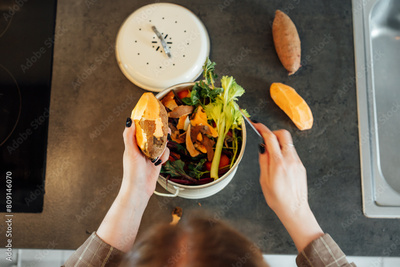 Compost the kitchen waste, recycling at home. Woman putting vegetables cutted leftovers into the garbage, compost bin on the table of kitchen. Environmentally responsible, ecology. Selective focus.