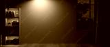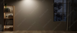 An empty room at night with a bookshelf, a dim light on an empty wall, and a rustic wooden floor.