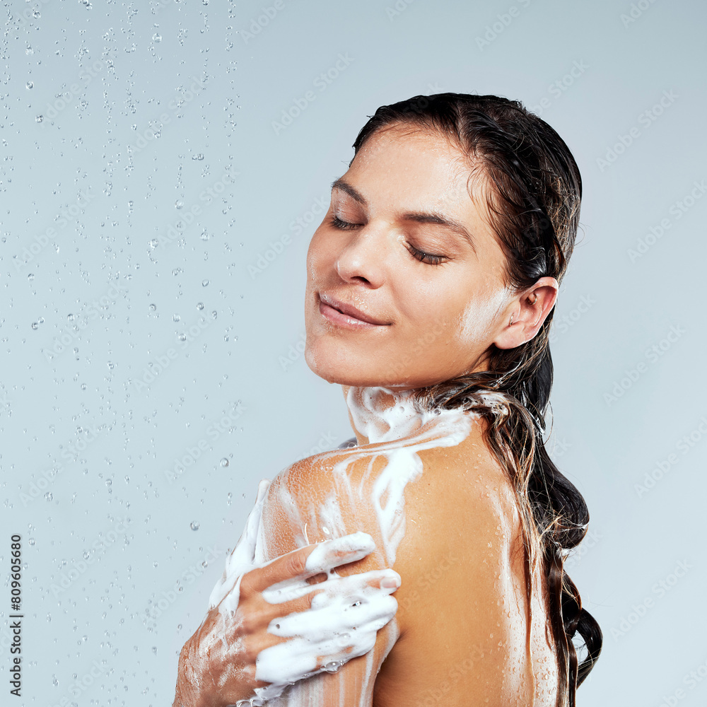 Studio, shower or calm girl washing for skincare, body hygiene or cleaning with soap. Water, white background or wet woman with wellness or foam for beauty, grooming or cleansing for morning routine