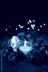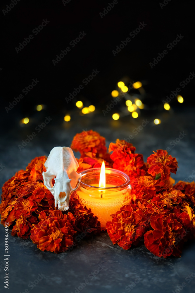 animal skull with burning candle and marigold flowers on abstract dark background. cempasuchil flowers - symbol of Mexico's Day of the Dead. dia de los Muertos holiday. spiritual esoteric ritual
