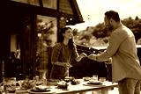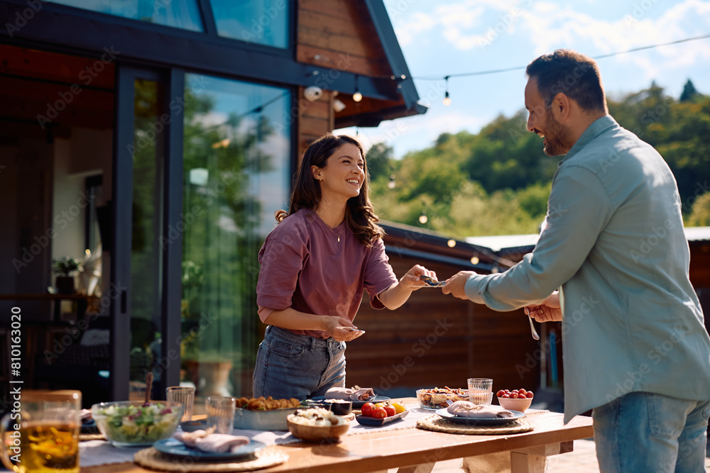 Happy couple setting dining table on patio.