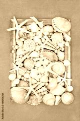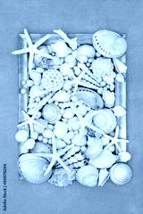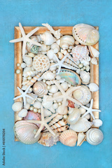 Seashell and pearl decorative abstract background with gold grunge picture frame on mottled blue background. Natural nature design with large collection of shells.