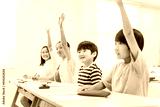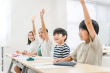 塾・学校の授業中に元気に挙手する小学生の男女生徒