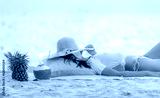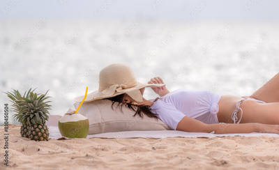 Sexy Caucasian young woman in white t-shirt and bikini lay dawn relax on the sand beach with hat beach, coconut juice and pine apple is summer holidays concept.