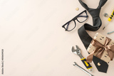 Special Father's Day surprises highlight top view of necessary tools, adjustable wrench, screws, nuts, screwdriver, elegant necktie, giftbox with ribbon bow, and glasses on neutral beige background