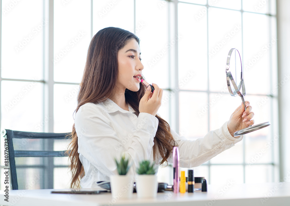 Asian beautiful smiling happy female sitting at home and doing her make-up near mirror morning. Young woman pretty long hair putting blush on her face applies powder with a brush. Self care, skin care