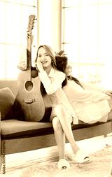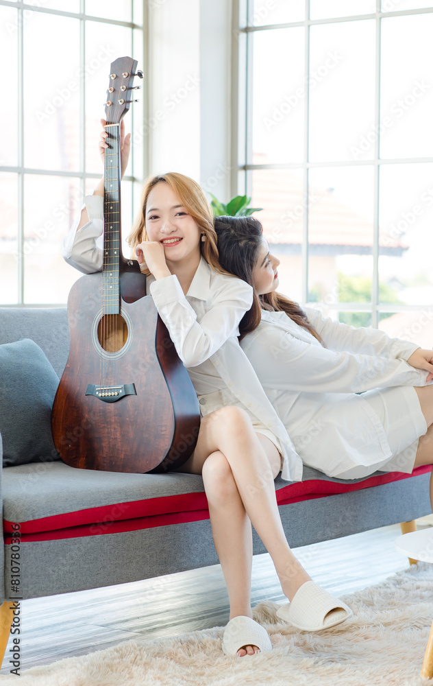 Two asian couple beautiful woman playing acoustic guitar, sing folk song together sitting on sofa at home, happy moments relaxing and enjoying lovers music and art therapy for people relax time.