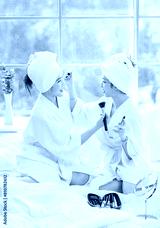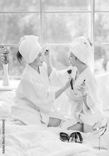 Joyful two asian happy beautiful young women smiling wearing bathrobes and wrapped in towels applying makeup, making and enjoy having fun on bed in bedroom at home