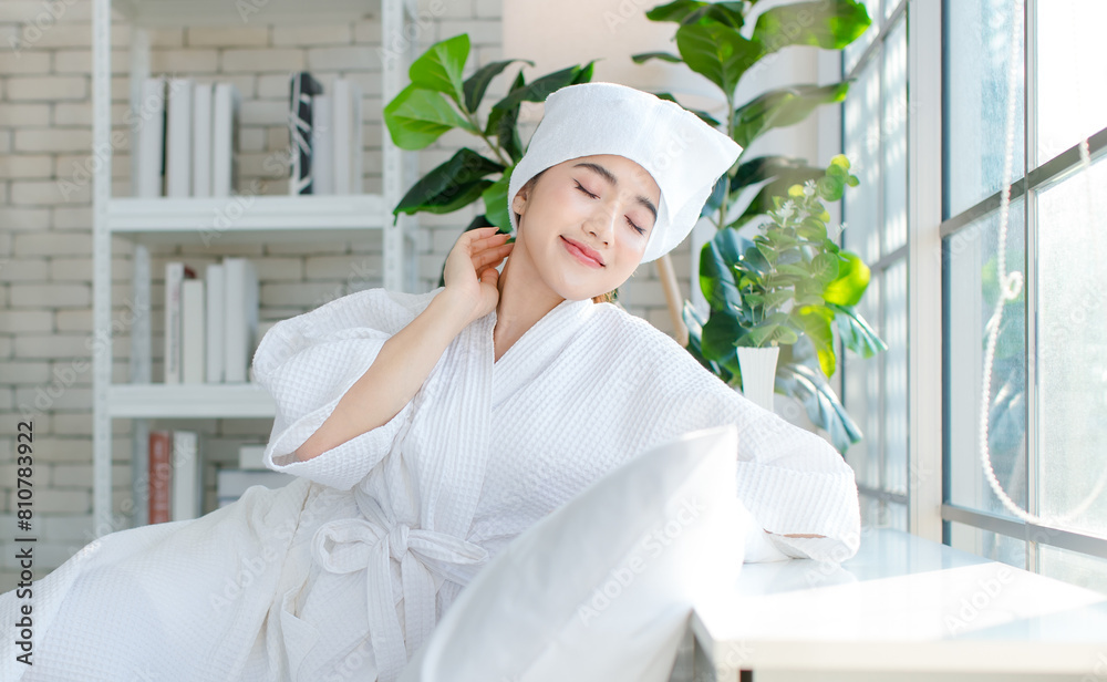 Asian happy beautiful young woman smiling wearing a towel and a white bathrobe sitting relaxed enjoy having fun, on the bed in bedroom spending time together at home, spa concept.
