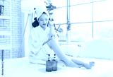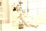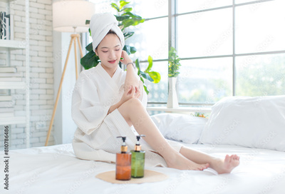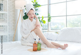 Asian happy beautiful young woman smiling wearing a towel and a white bathrobe sitting relaxed enjoy having fun, on the bed in bedroom spending time together at home, spa concept.