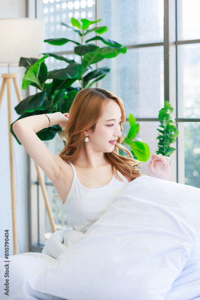 Asian beautiful female girls sitting drinking coffee in a bedroom, Cheerful young woman smiling, happy sitting on the bed, feeling so relax at home weekend breakfast lifestyle. Healthcare concept