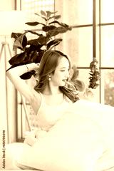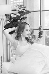 Asian beautiful female girls sitting drinking coffee in a bedroom, Cheerful young woman smiling, happy sitting on the bed, feeling so relax at home weekend breakfast lifestyle. Healthcare concept