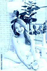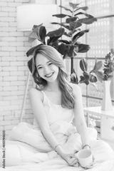 Asian beautiful female girls sitting drinking coffee in a bedroom, Cheerful young woman smiling, happy sitting on the bed, feeling so relax at home weekend breakfast lifestyle. Healthcare concept