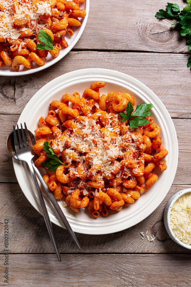 Cavatappi pasta with tomato sauce and parmesan cheese