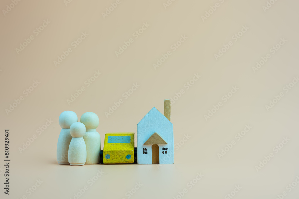 Wooden family doll human with house and car, couple relationship symbol. Insurance and property investment, saving for the future and building a house, family for future concept.