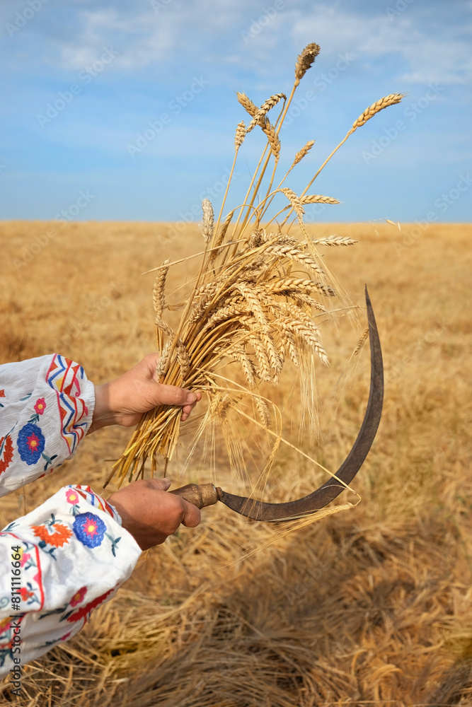 Wheat field harvest and farmer woman in ethnic folklore dress hold ripe wheat straws and old sickle in hands. wheat and sickle, harvesting and agriculture concept. rustic landscape